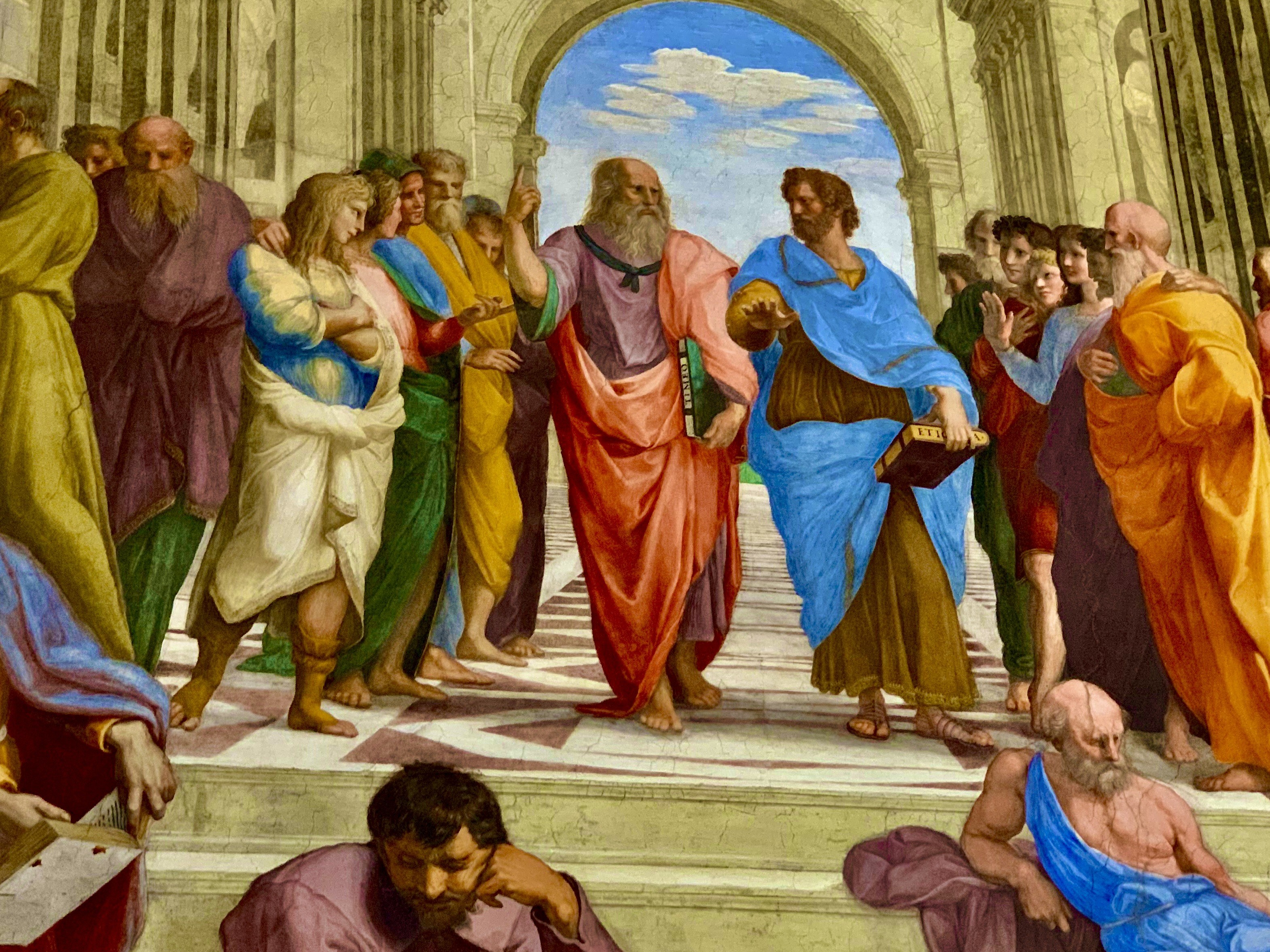 Plato and Aristotle in the midst of other Greek scholars. Plato points to heavens and Aristotle to the reality in front of him. School of Athens by Raphael, 1511. Vatican Museum. Kevin Moffett.