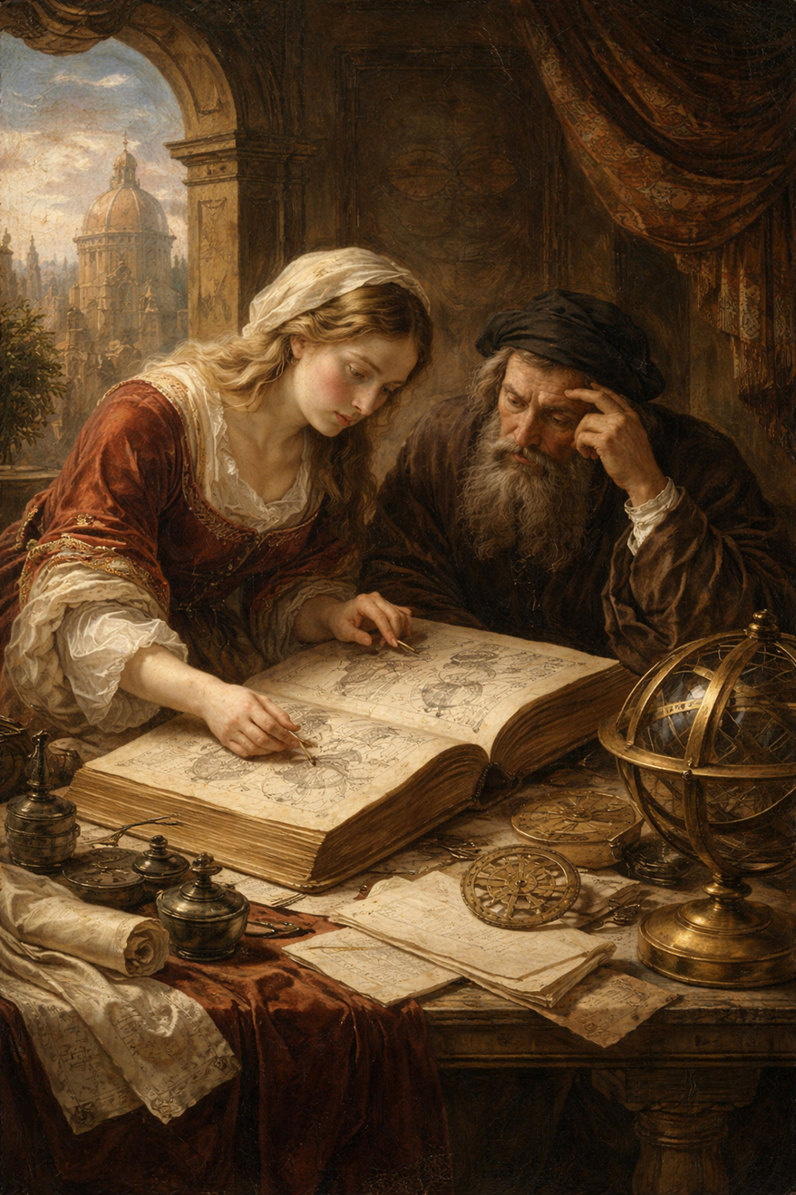 É nesse ponto que a imagem gerada por inteligência artificial abaixo se impõe como prova silenciosa. À primeira vista, nada nela denuncia a técnica. Ela poderia passar por uma pintura renascentista: estudiosos debruçados sobre mapas celestes, composição equilibrada, luz dramática. Tudo remete ao esforço humano do saber.