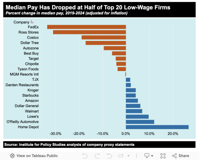 Our analysis finds that at half of these firms, median worker pay actually declined in real terms between 2019 and 2024. For the group as a whole, average median pay dropped 4.6 percent to just $29,087.
