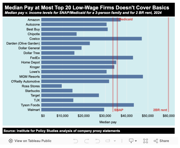 Fifteen of the Low-Wage 20 reported median pay in 2024 below the $35,631 income limit for a family of three to be eligible for Medicaid. At 13 of the firms, median pay fell below the $33,576 family threshold for SNAP food aid.