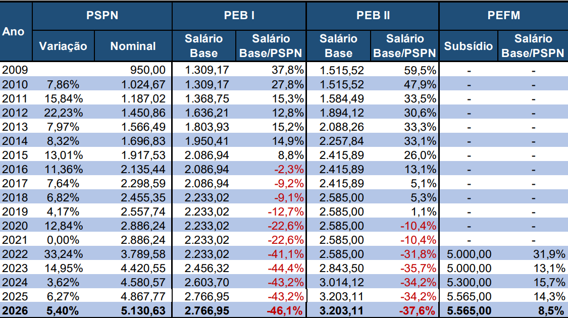Fonte: DIEESE, 2026. Diferença entre os Salários Base dos PEB I, PEB II e PEFM em relação ao PSPN.