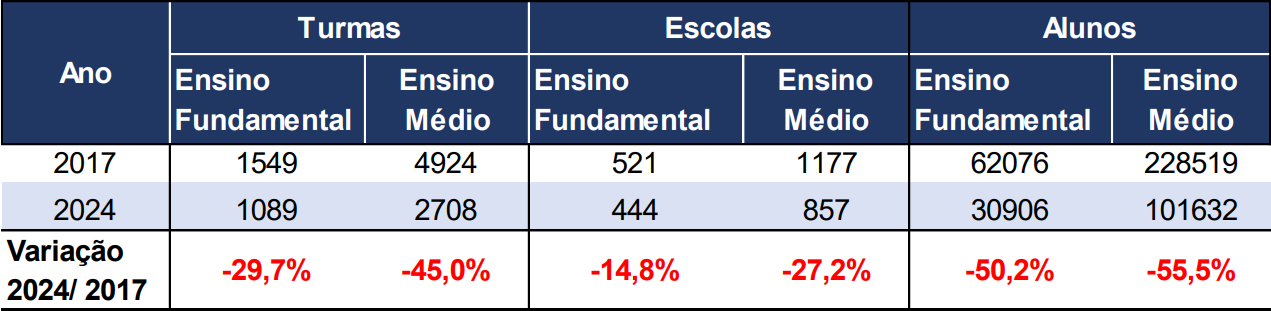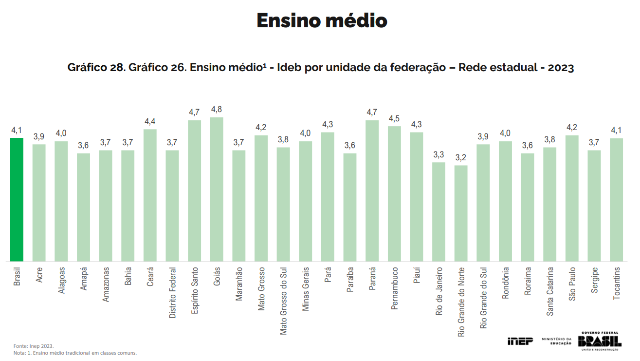 As consequências dessa dupla precarização, laboral e pedagógica, refletem-se na redução aguda dos indicadores de qualidade de ensino. No Índice de Desenvolvimento da Educação Básica (Ideb) – indicador que relaciona o desempenho dos estudantes em avaliações externas de larga escala com dados de fluxo escolar, o Estado de São Paulo sofreu variação negativa expressiva no Ensino Fundamental, despencando no índice nacional. No Ensino Médio, a queda foi ainda mais drástica, saindo das primeiras posições em 2019 para o 9º lugar, como podemos verificar na tabela do INEP (Instituto Nacional de Estudos e Pesquisas Educacionais).